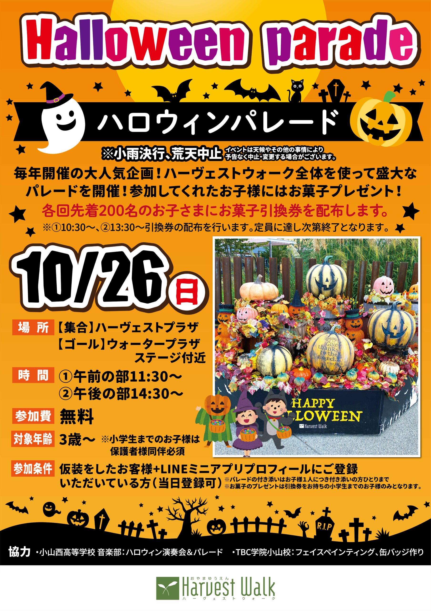 毎年開催の大人気企画!ハーヴェストウォーク全体を使って盛大なパレードを開催!参加してくれたお子様にはお菓子プレゼント!さらに、ハーヴェストウォークの対象店舗で使えるお得なチラシもお配りいたします。