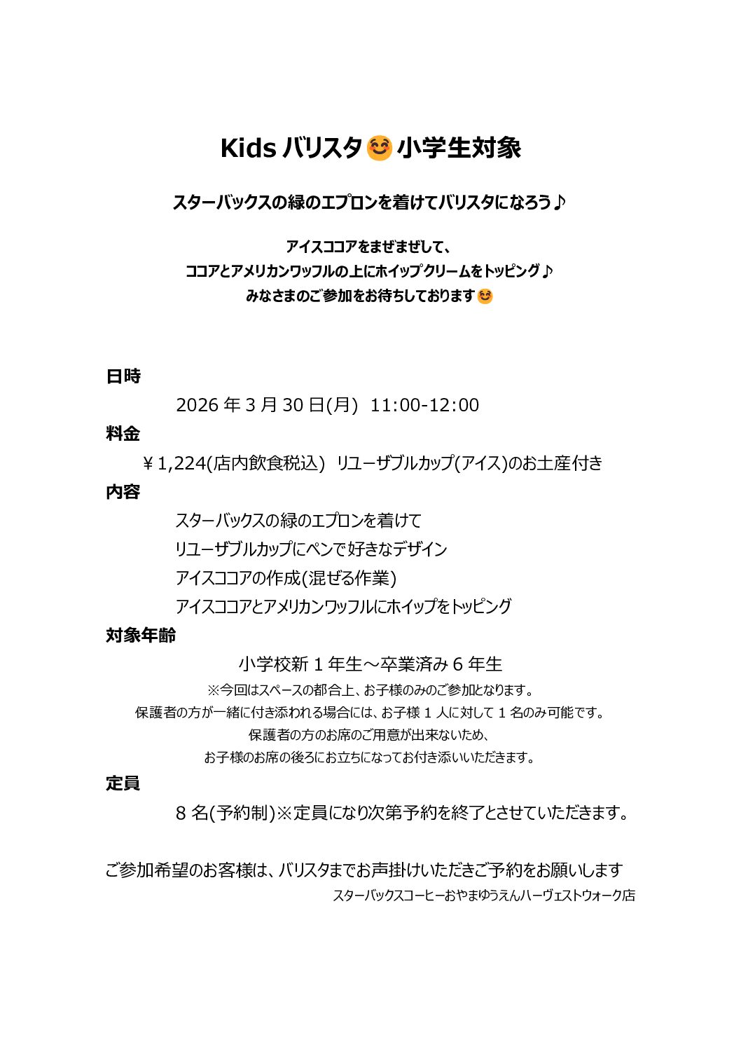 3月30日(月)Kidsバリスタ開催のお知らせ