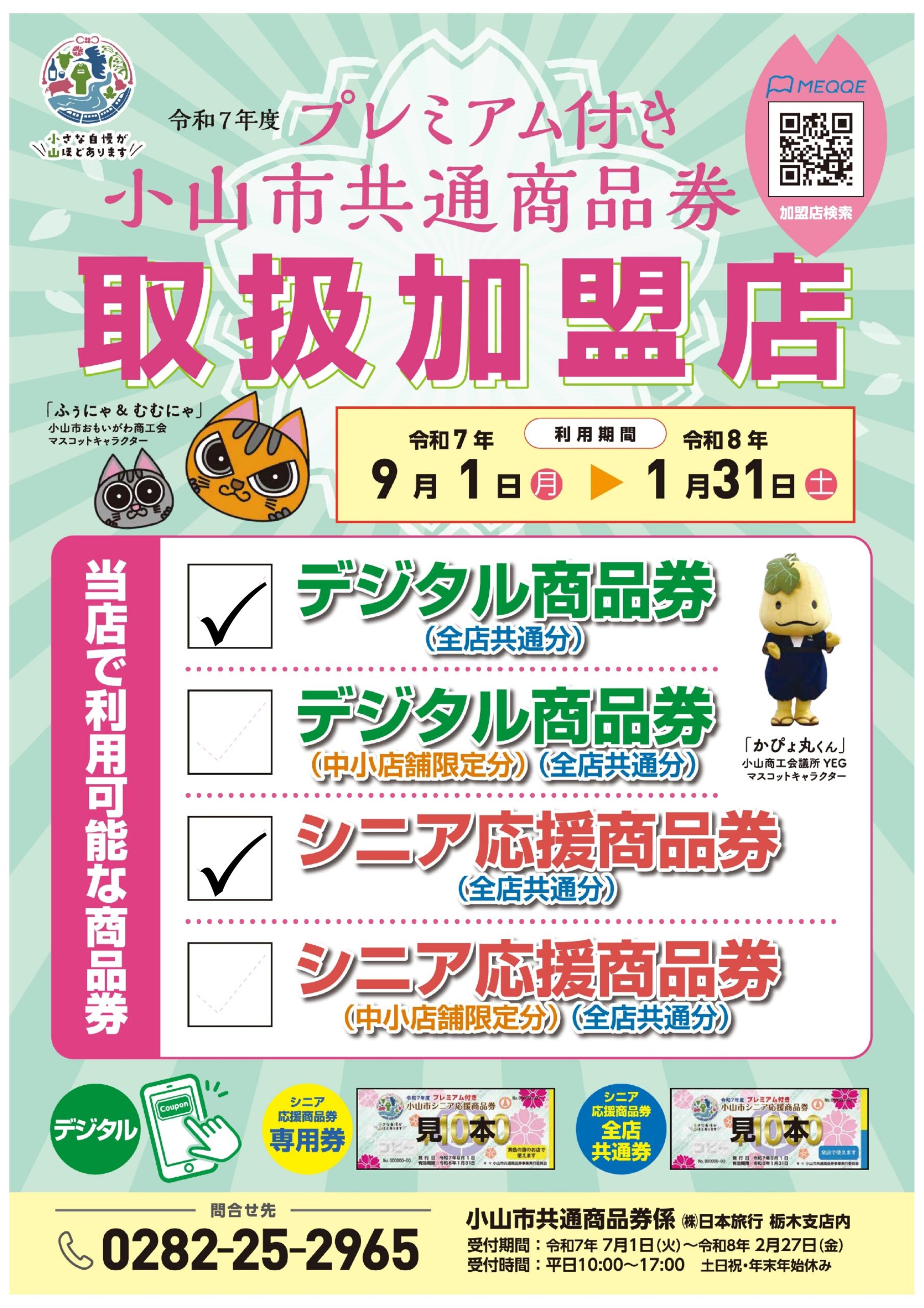 令和7年度小山市共通商品券が対象店舗にてご利用いただけます。