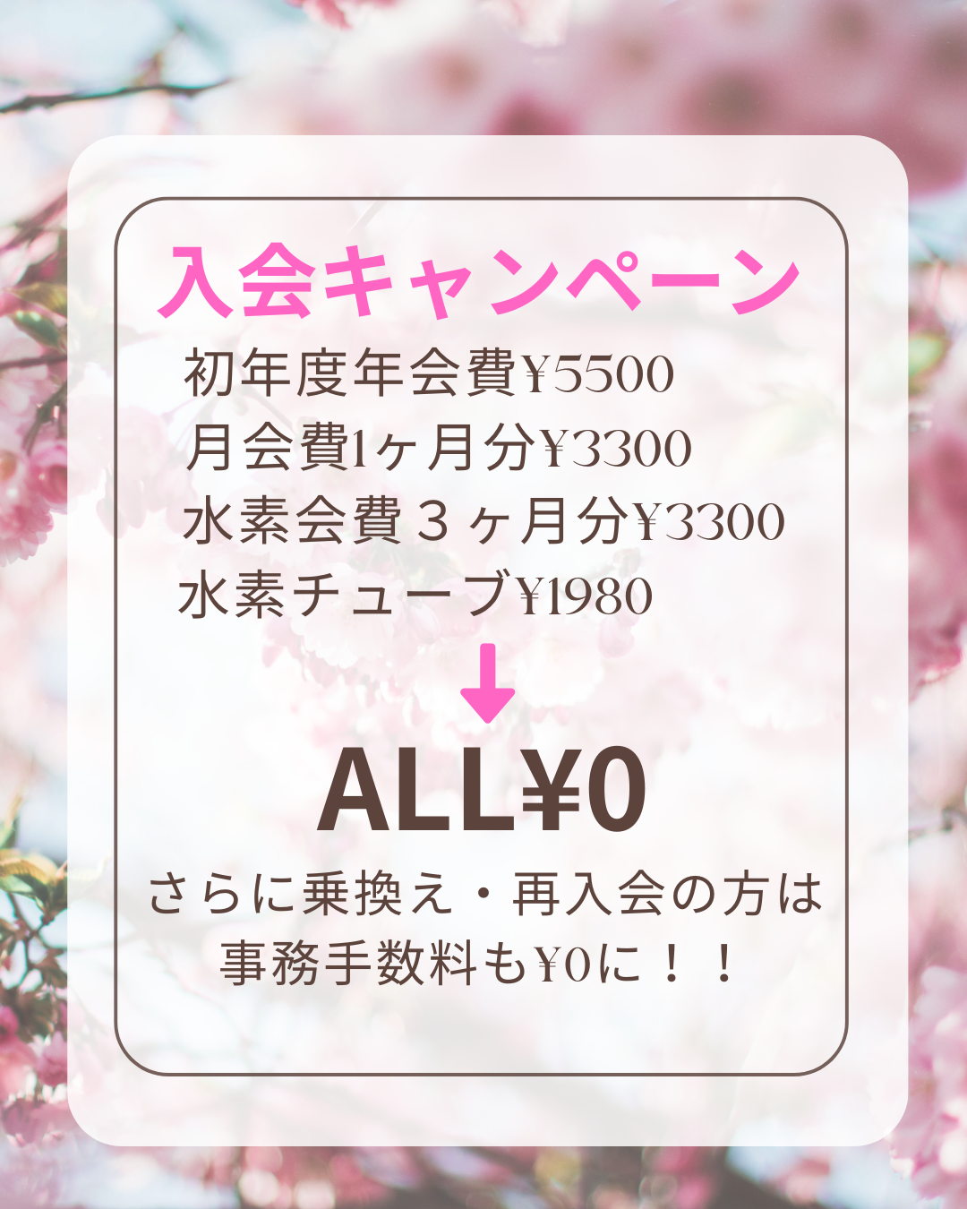 初年度年会費5,500円、月会費1ヶ月分3,300円、水素会費3ヶ月分3,300円、水素チューブ1,980円がすべて0円に!!