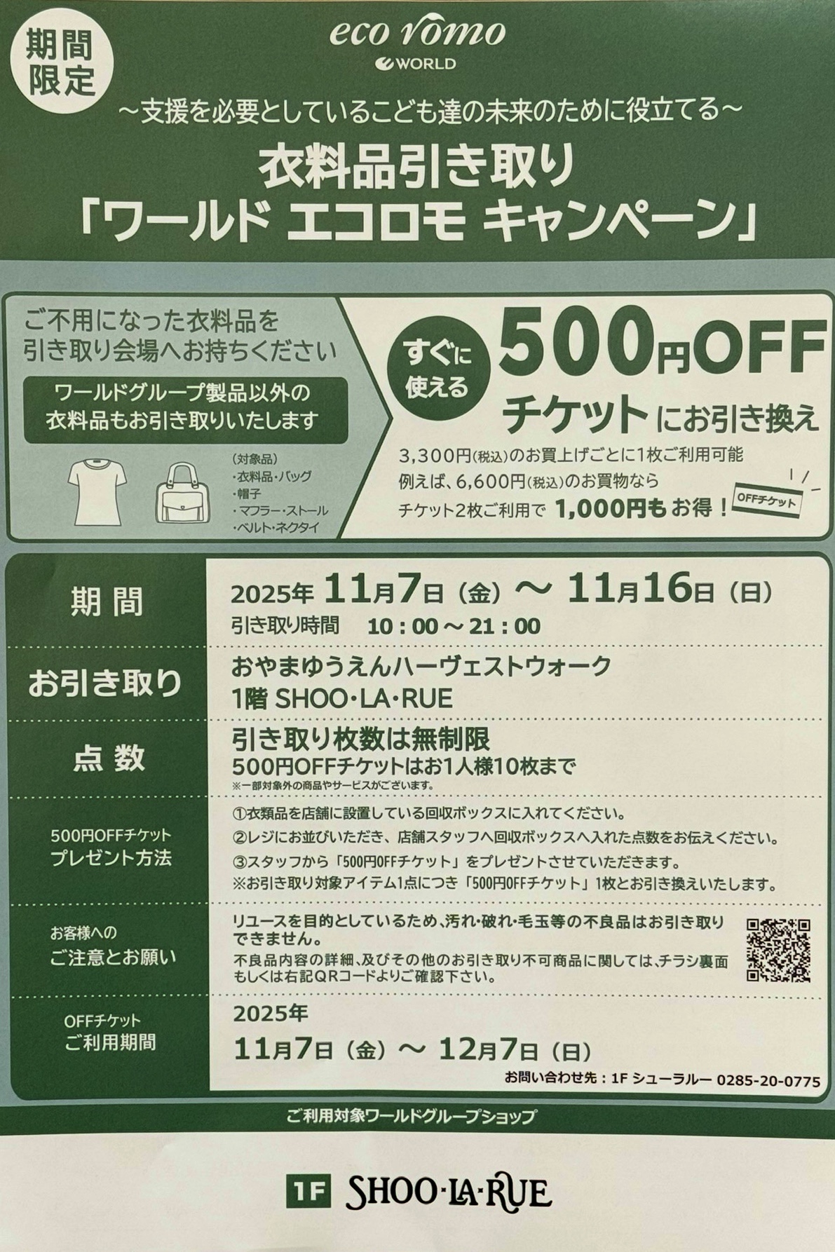 ♪♪衣料品引き取り「ワールド エコロモキャンペーン」【11月7日(金)~11月16日(日)】