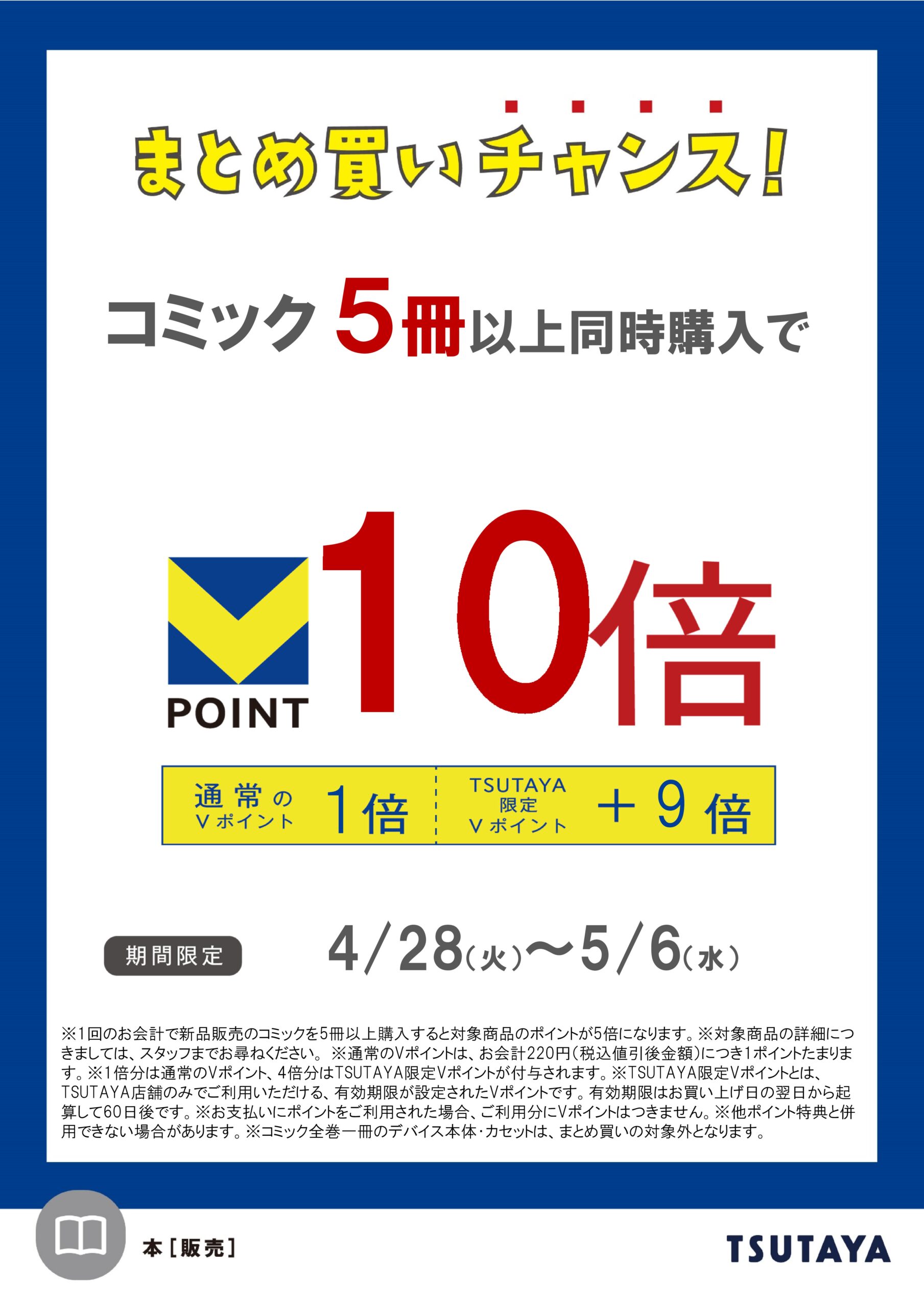 5月6日(水)まで、コミック5冊以上同時購入でVポイント10倍(通常Vポイント1倍+TSUTAYA限定Vポイント9倍)